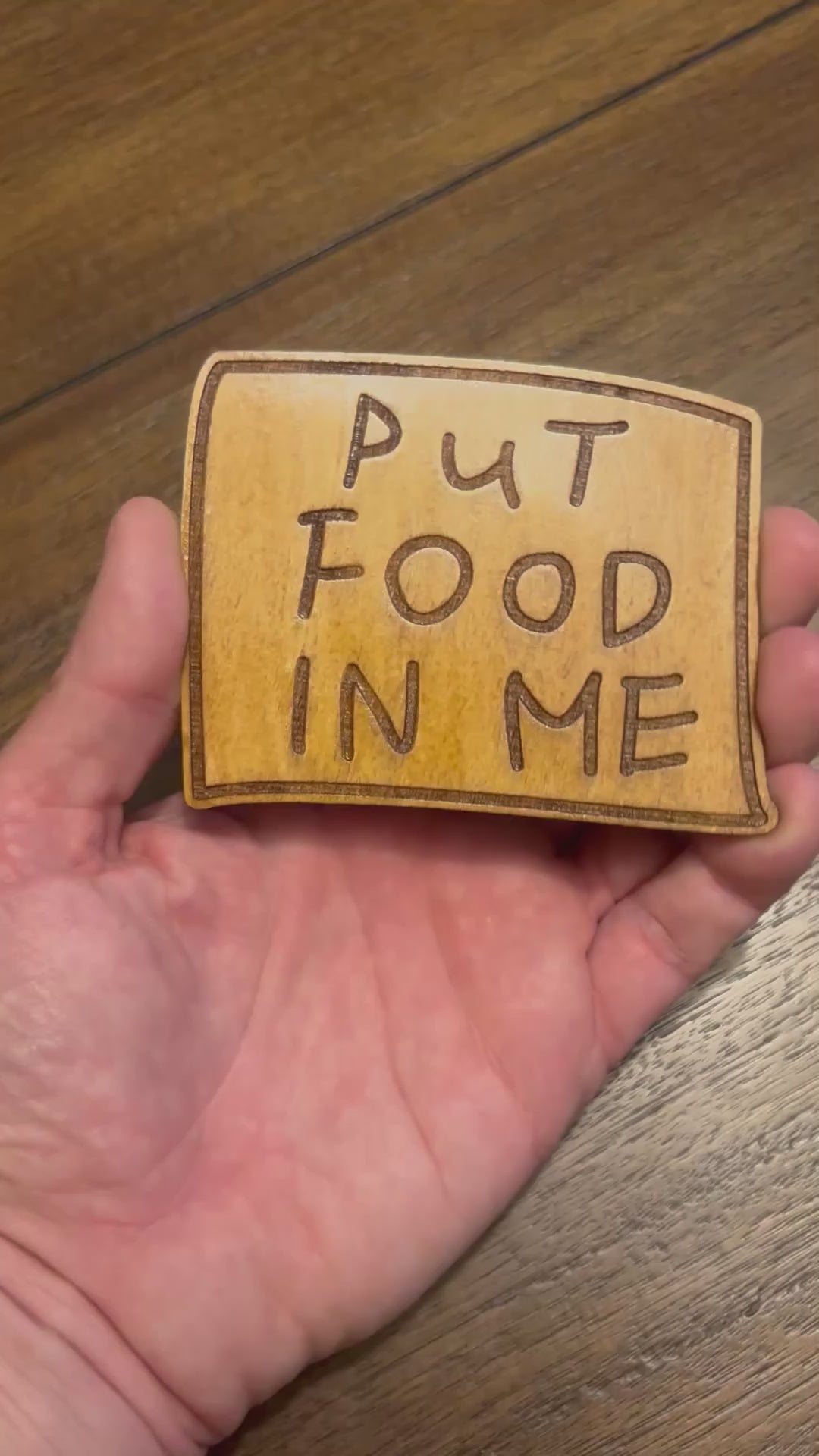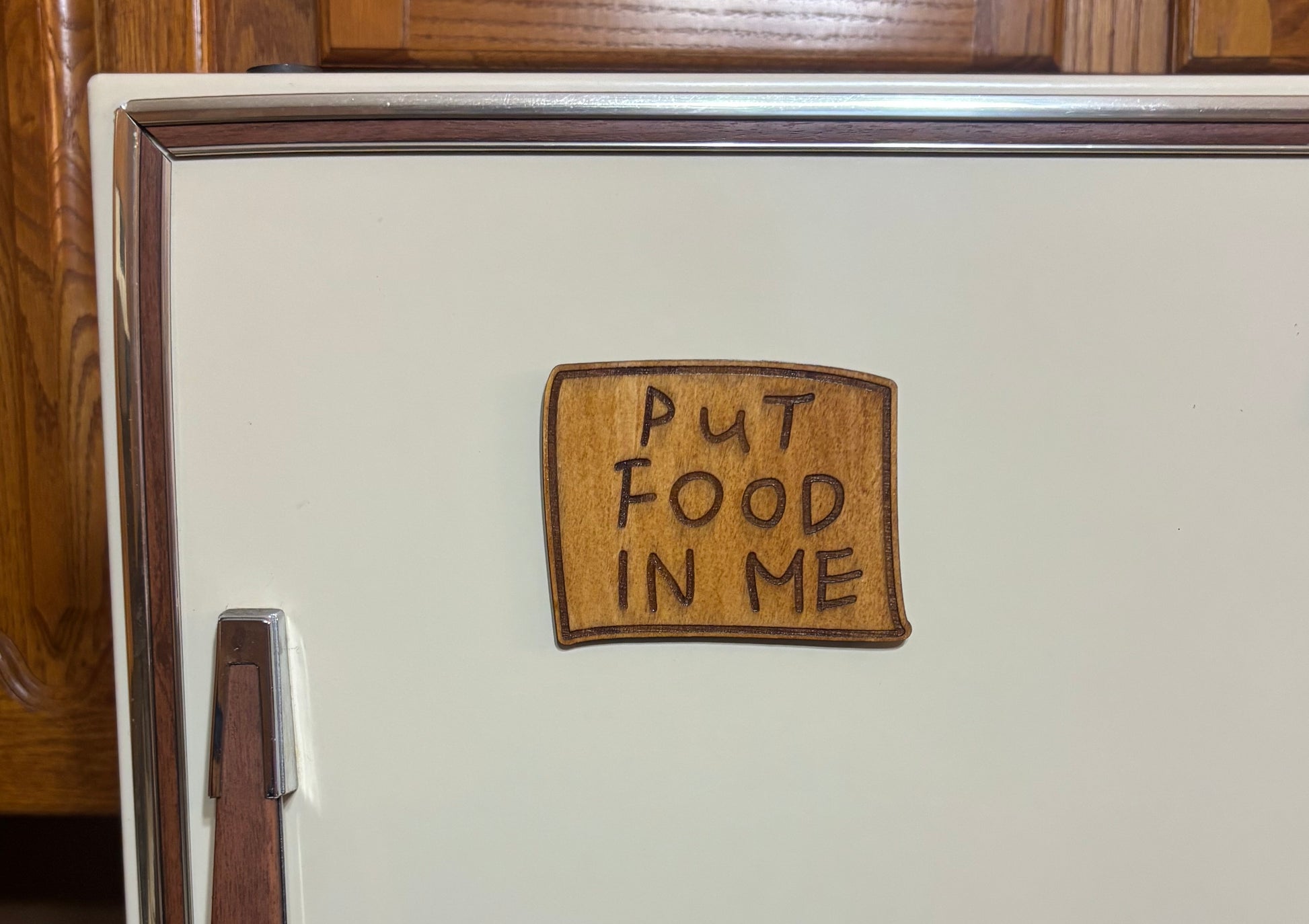 Stained basswood fridge magnet of Flanders' Put Food in Me sticky note from the Simpsons.