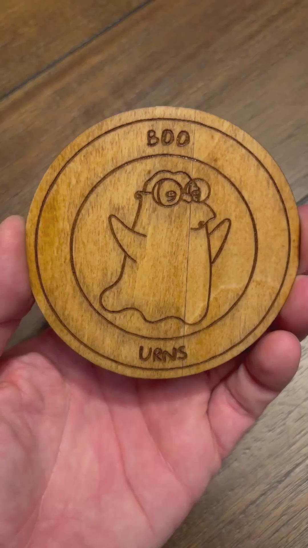 Stained basswood fridge magnet of Hans Moelman as a ghost saying boo-urns from the Simpsons.