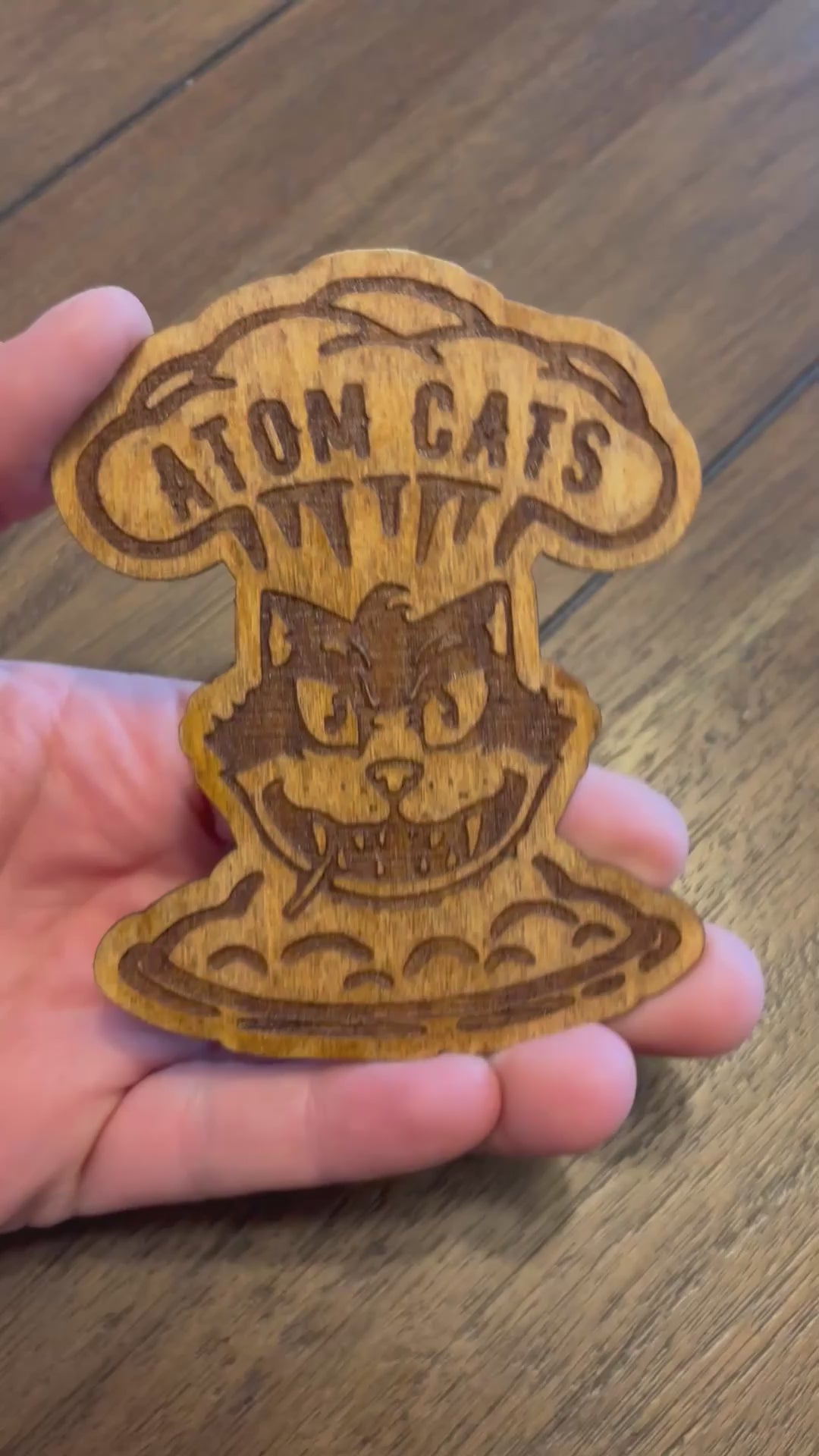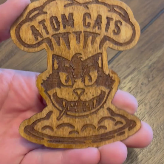Stained basswood fridge magnet of the Atom Cats logo from the Fallout video games