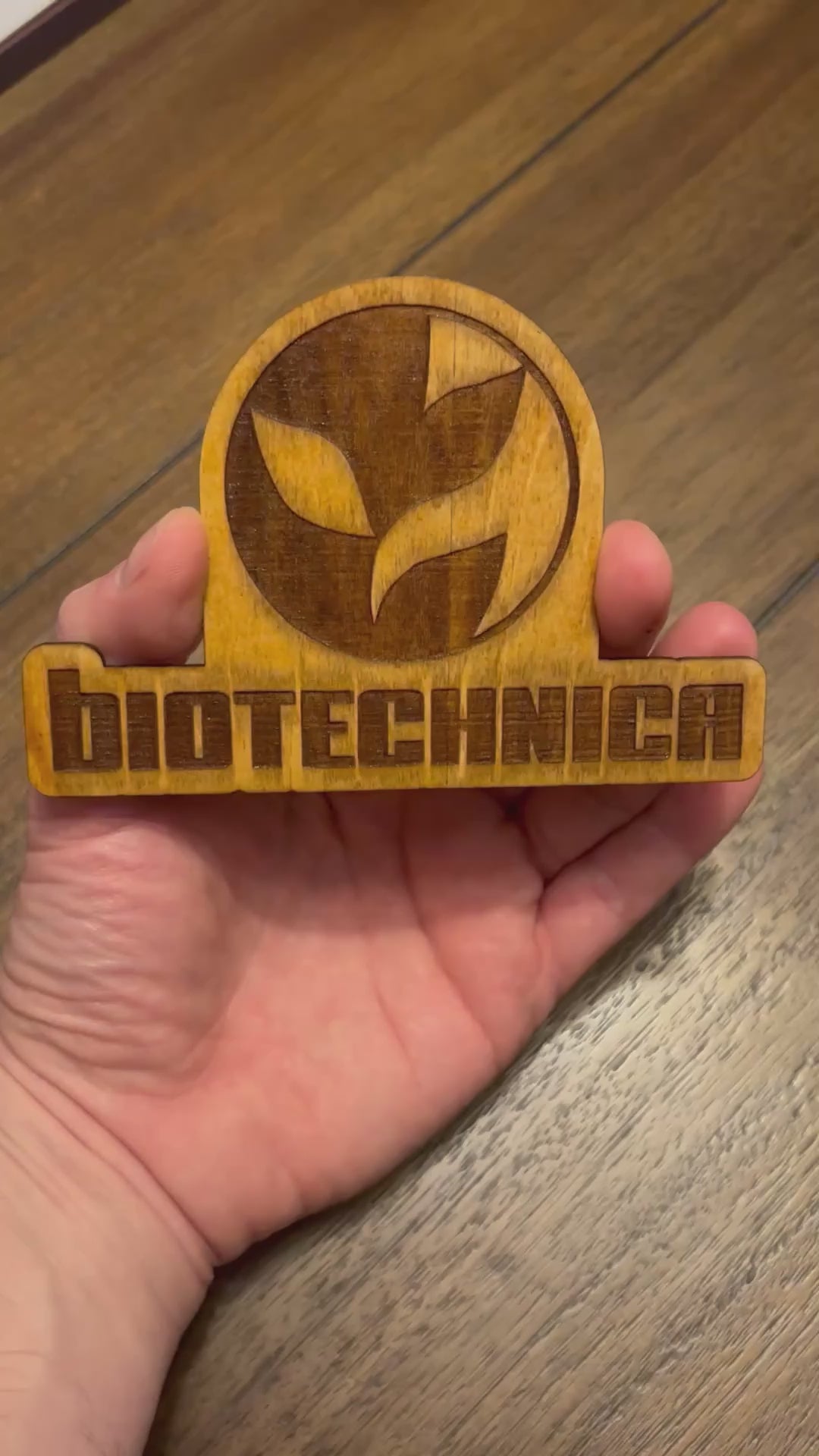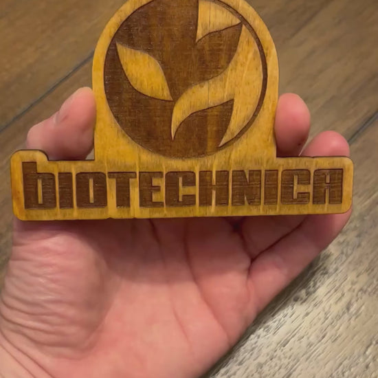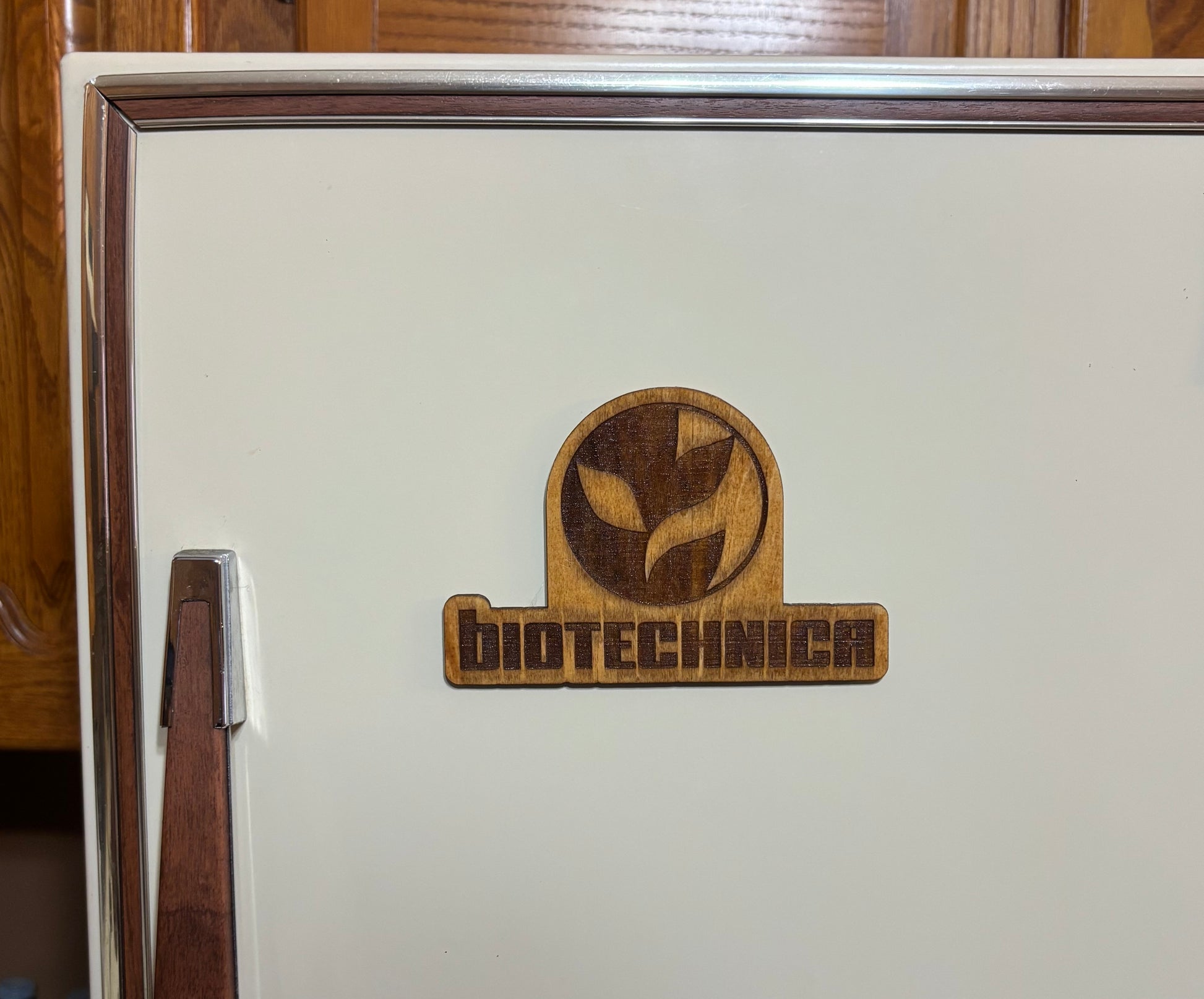 Stained basswood fridge magnet of the Biotechnica logo from the Cyberpunk 2077 video game